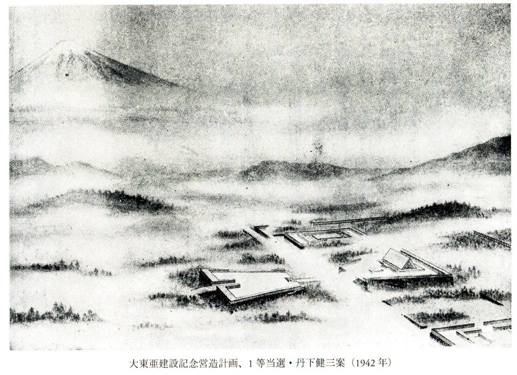 Regarding “World War II and Architecture,” essays have discussed architecture and architects during the 15-year war period to some extent. These include “Architecture and Culture in the 1930s” (Gendai Kikakushitsu), edited by the Contemporary Architecture Research Group (1981). Some other essays include “Architecture as a Movement: Notes on Showa Architecture” (Kenchiku Bunka, November 1975). Another is “The State and Postmodernism” (Kenchiku Bunka, April 1984). Lastly, “Shuji Nuno’s Architectural Essays III: State, Style, and Technology—Architecture in the Showa Era” (Shokokusha, 1998) is also noted. The primary issue often discussed is the “Imperial Crown (Annexation) Style” (Shimoda Kikutaro). The “Greater East Asia Architectural Style” is also frequently examined. These styles are considered forms of Japanese fascism. Kenzo Tange’s “Greater East Asia Construction Memorial Construction Plan” (1942) (Figure C) is symbolically considered.